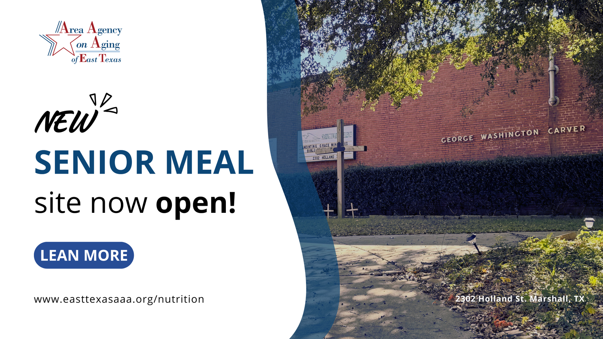 The Area Agency on Aging of East Texas (AAA) opened a new congregate meal site in Marshall on Monday, December 15th. Older adults, aged 60 and up, eligible for the Senior Nutrition Program will be able to enjoy a hot lunch, good conversation, and a friendly place to gather. Location George Washington Carver Community Center 2302 Holland St Marshall, TX 75670 Meal Hours Monday–Thursday 11:00 AM–12:30 PM Phone 903-923-8410 The Senior Nutrition Program supports adults age 60 and older through both congregate meals and home-delivered meals. These meals follow dietary guidelines and help older adults stay connected and healthy. For folks who can’t travel, home-delivered meals bring food, a wellness check, and a bit of company to their door. How to Enroll Adults age 60 and older can join the Senior Nutrition Program by contacting the provider for their county listed at: easttexasaaa.org/nutrition , or by receiving a referral from AAA staff. Caregivers who care for someone receiving home-delivered meals may also be referred for services by calling AAA. The Carver Community Center site will give more Marshall and Harrison County residents a place to eat, visit, and keep a steady routine. If you or someone you know could benefit, contact the AAA for assistance!