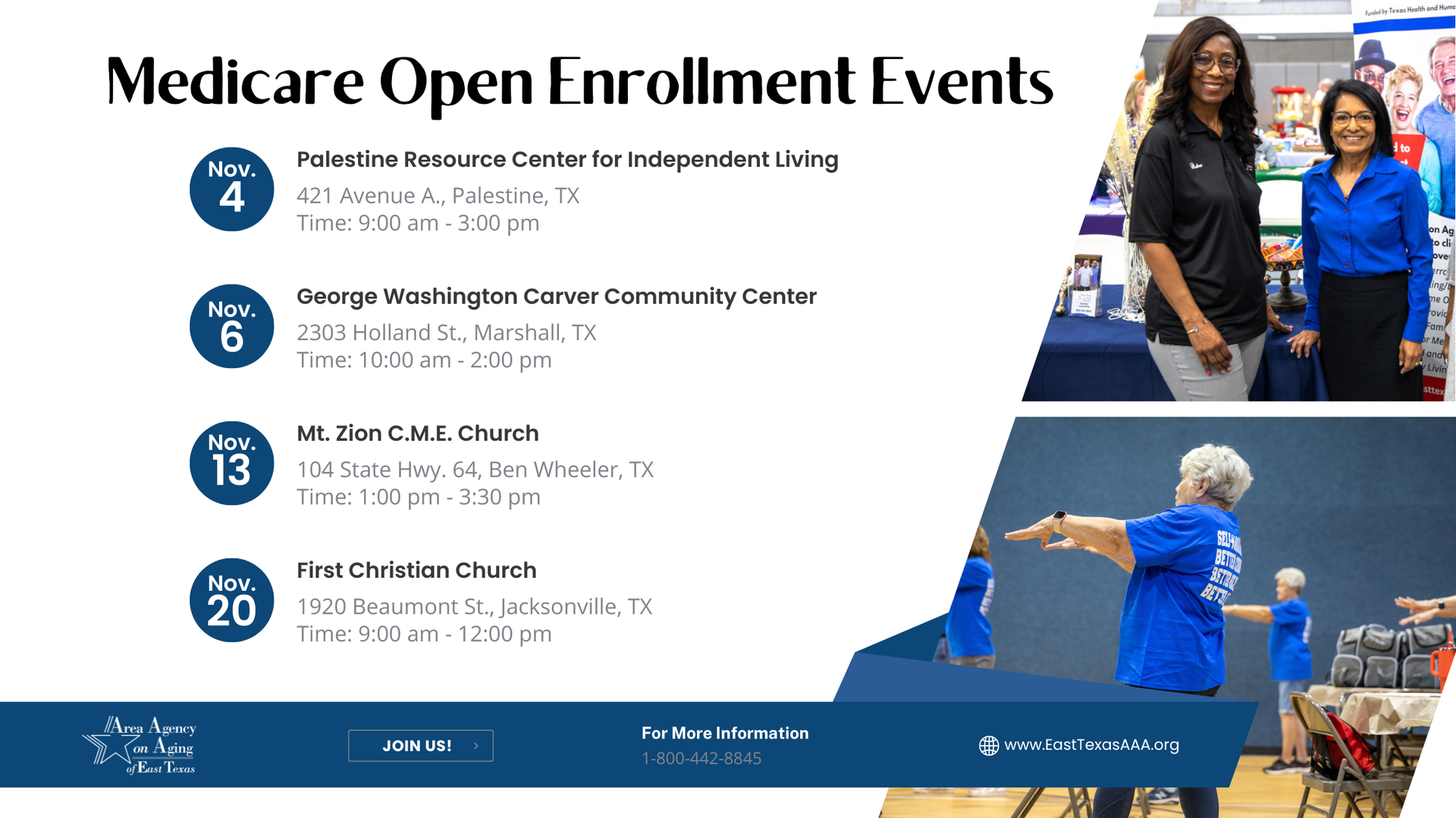 Medicare Open Enrollment runs from October 15 until December 7, and people with Medicare will have more coverage options to consider. Plan costs and covered benefits have changed, so our Area Agency on Aging of East Texas (AAA) is offering benefits counseling assistance to encourage Medicare recipients to review their coverage choices and decide on the options that best fit their health needs.
